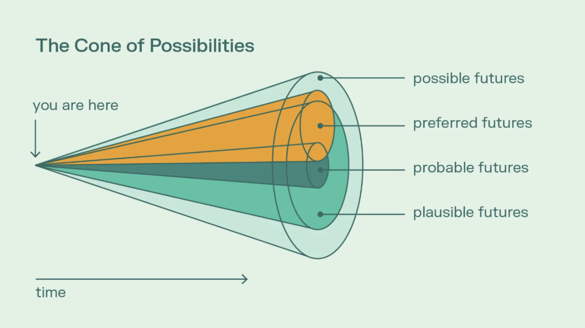 A model that might be helpful is the one developed by the futurist Joseph Voros in 2003 called the Cone of Possibilities. Imagine yourself standing with a flashlight looking into the future.